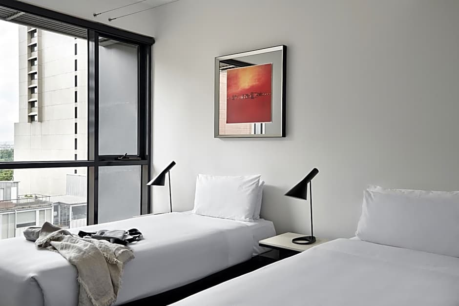 Located on the upper levels of the hotel boasting city views and tons of natural light, the Superior Two Bedroom Apartment features one queen bed and three single beds, making it perfect for a family or a small group. The apartment has two spacious bedrooms and two bathrooms at one end, one room with an ensuite. The fully-equipped kitchen overlooks the sitting, dining room and balcony. Complete with a flat-screen TV, individually controlled heating and cooling, high-speed internet access, a washer, a dryer and more, the Superior Two Bedroom Apartment is your perfect base at the Paris end of Melbourne CBD. Should you require the apartment to sleep six guests, an extra person fee will apply.