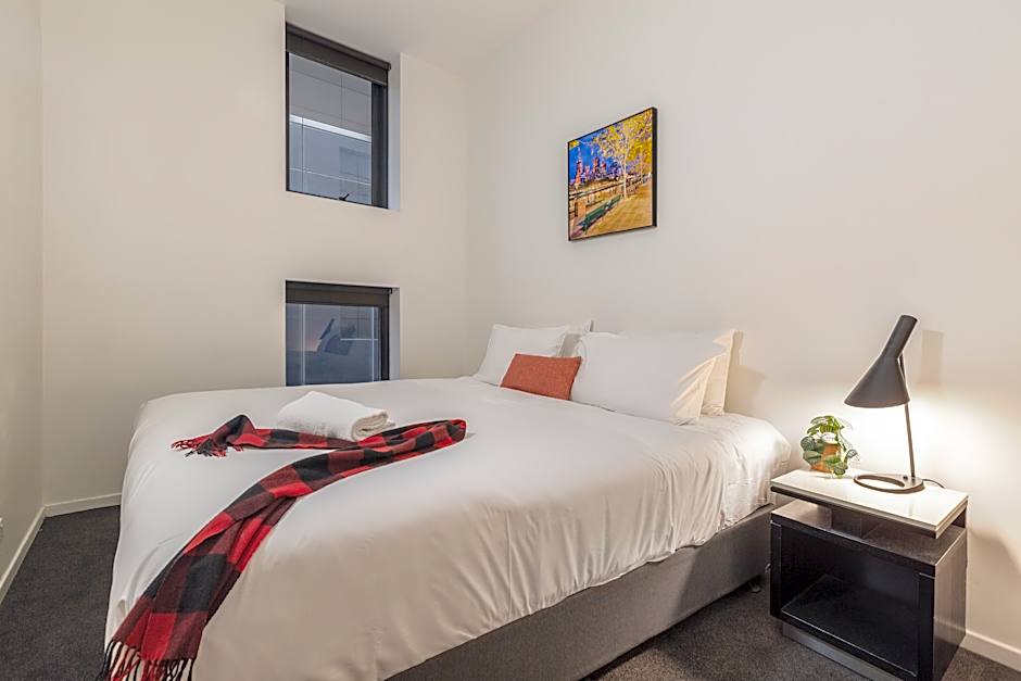 Our large Two Bedroom Apartment features a queen bed and two single beds, fully-equipped open plan kitchen with breakfast bar, a separate living area flooded with natural light, flat-screen TV, individually controlled heating and cooling, fast WiFi and more. The bathroom includes a washer and a dryer. Please provide your bedding preference in the comments. Should you require the apartment to sleep five guests, a fifth person fee will apply.